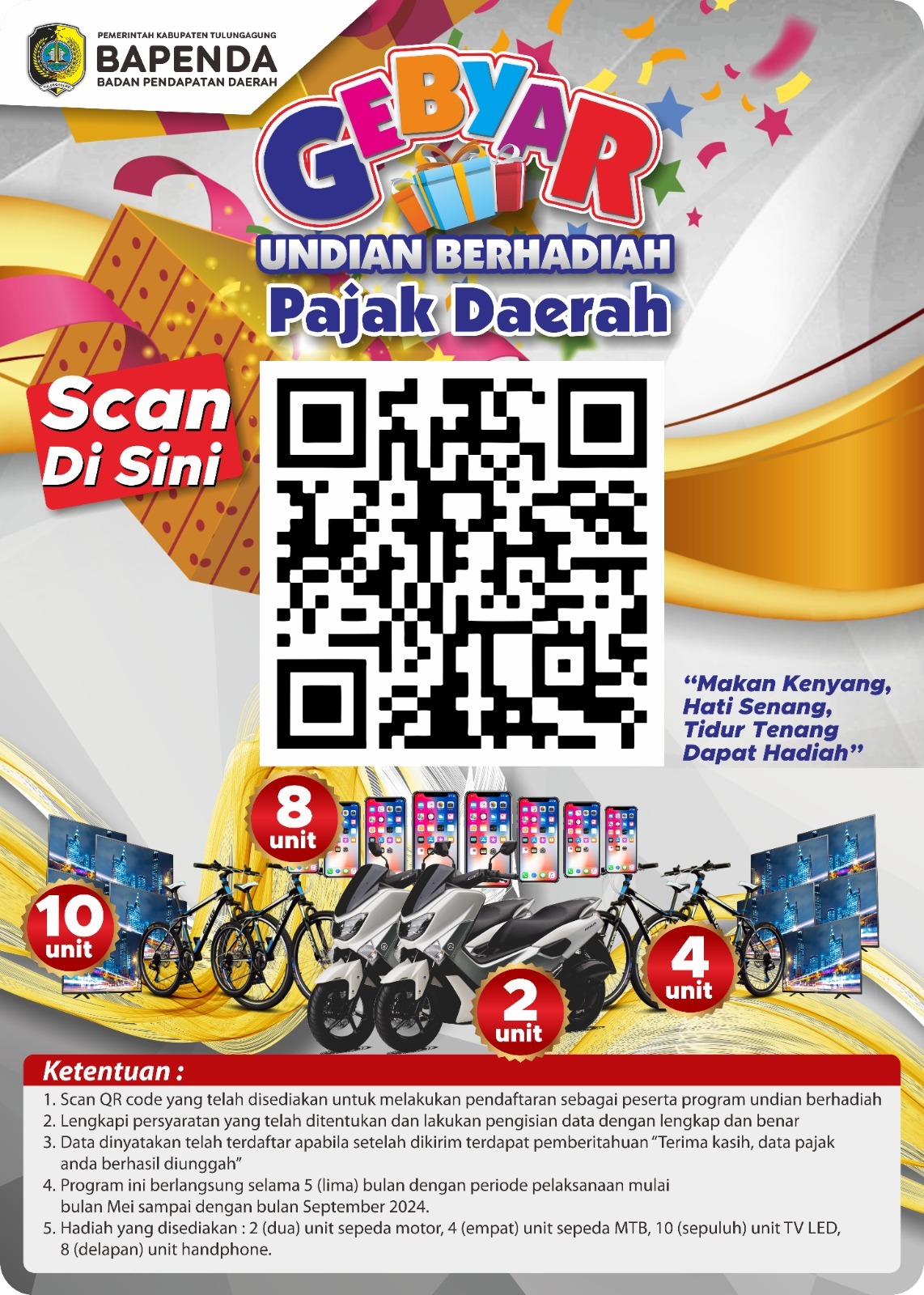 “Makan Kenyang, Hati Senang, Tidur Tenang, Dapat Hadiah” adalah program undian berhadiah pajak daerah yang diselenggarakan oleh Badan Pendapatan Daerah (Bapenda) Kabupaten Tulungagung. Undian berhadiah ini ditujukan kepada konsumen di sektor restoran, tempat hiburan dan hotel sekaligus sebagai salah satu upaya mensosialisasikan kepada masyarakat bahwa atas jasa layanan yang disediakan di ketiga sektor tersebut, masyarakat selaku konsumen dikenakan pajak daerah. Diharapkan dengan adanya program tersebut, masyarakat semakin memahami tentang pajak daerah.
